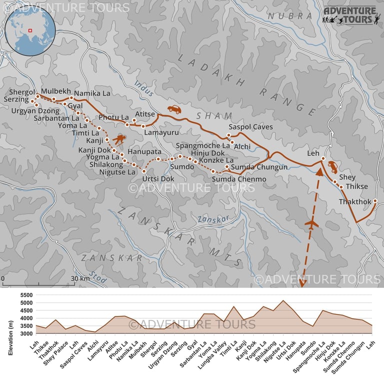 Take off on an unforgettable 11 days trekking adventure through the breathtaking landscapes of West Ladakh, starting in the serene village of Serzing. This spiritual journey follows the footsteps of Guru Padmasambhava, Lotsawa Rinchen Zangpo & Mahasiddha Naropa, while taking you through stunning valleys and majestic mountains, culminating in the picturesque destination of Sumda Chungun.